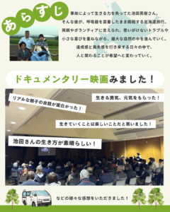 池田英樹さんは交通事故で首から下を麻痺し、生きる力を失いかけた時期もありました。 そんな池田さんが、呼吸器をつけて初めて北海道旅行に挑戦したドキュメンタリー映画です。